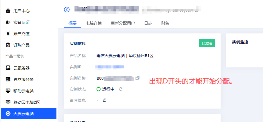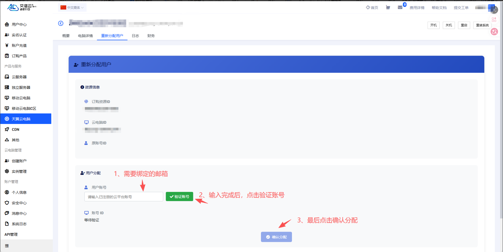 1、点击左侧侧边栏的云电脑管理——天翼云电脑-管理-重新分配用户,进行邮箱的绑定。
