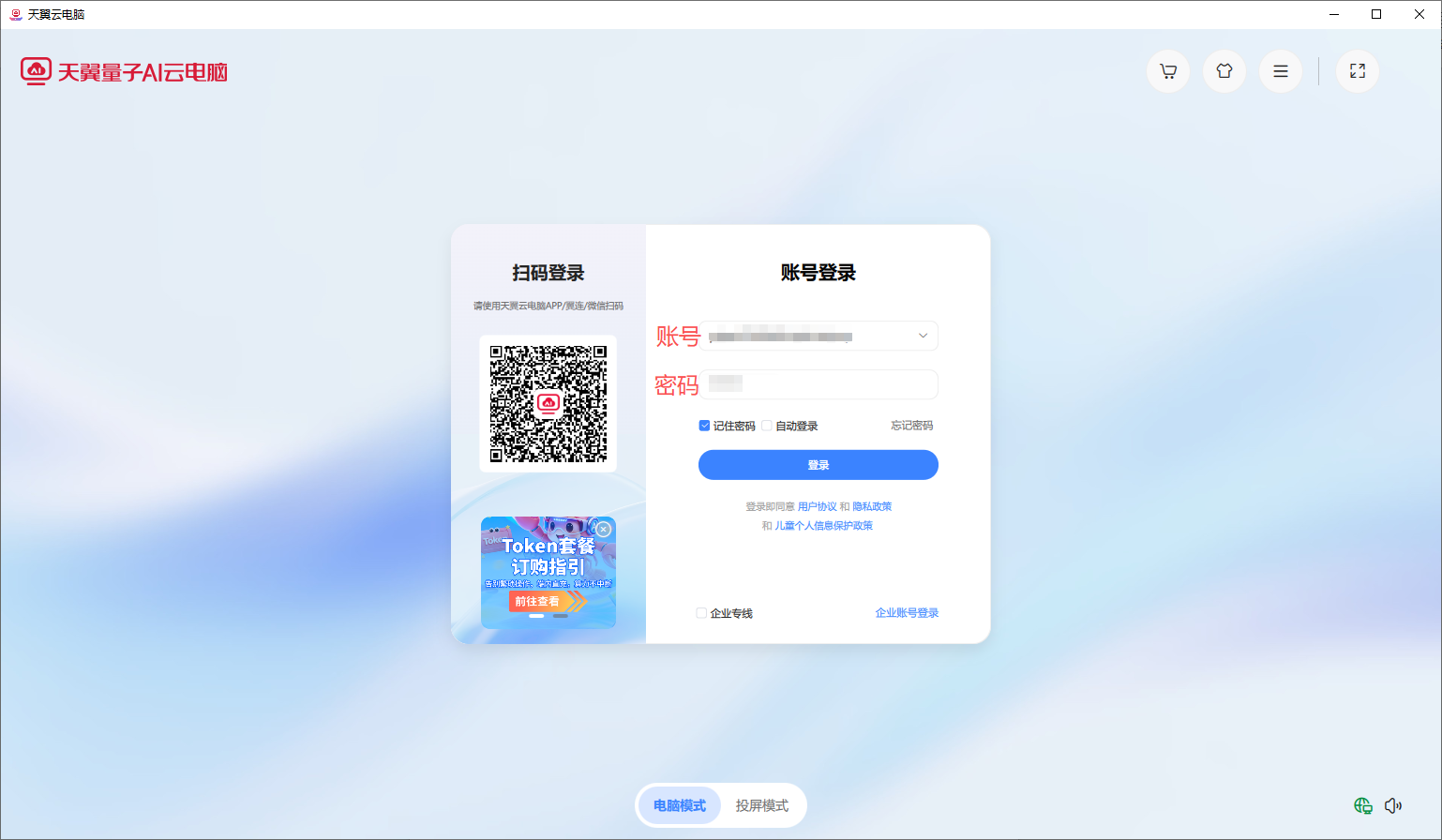 6、打开天翼云电脑客户端,将账号和密码复制进来